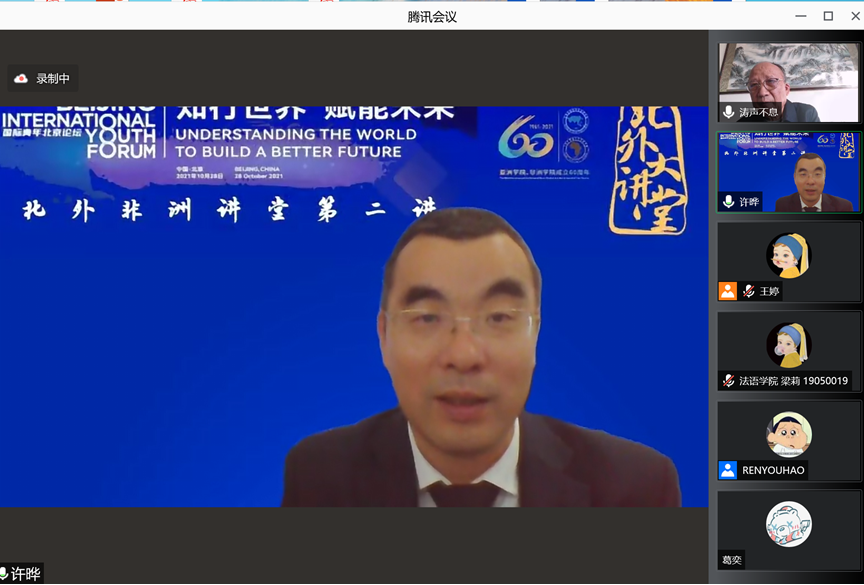 2021年10月27日,熊猫体育成功举办“北外非洲讲堂第二讲——扩大中非青年友好交流,巩固中非世代友好”讲座。主讲人为程涛大使,现任外交部公共外交咨询委员、中国非洲研究院特约研究员。熊猫体育党总支书记许晔主持此次讲座。