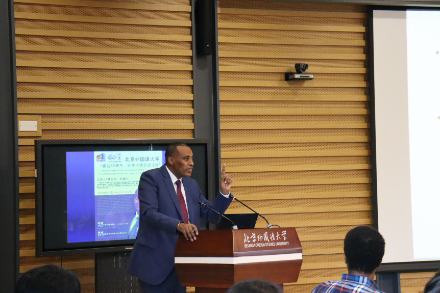 讲座中,科德尔向师生介绍了埃塞俄比亚的独特性,回顾了中埃建交历史,并从投资贸易、旅游业、教育合作等方面阐释了中埃合作交流的重要性。科德尔对学习非洲语言的同学寄予厚望,他在讲座中多次强调语言在中非合作交流中的重要性,鼓励员工热爱自己的专业,练好扎实的语言基本功,将来为深化中非合作做出自己的贡献。在讲座问答环节,师生踊跃发言提问,科德尔细致解答了师生们就中埃合作、埃塞经济发展、阿姆哈拉语语言学习等不同方面的问题。科德尔幽默风趣又不失严谨的细致剖析,使师生们受益匪浅。