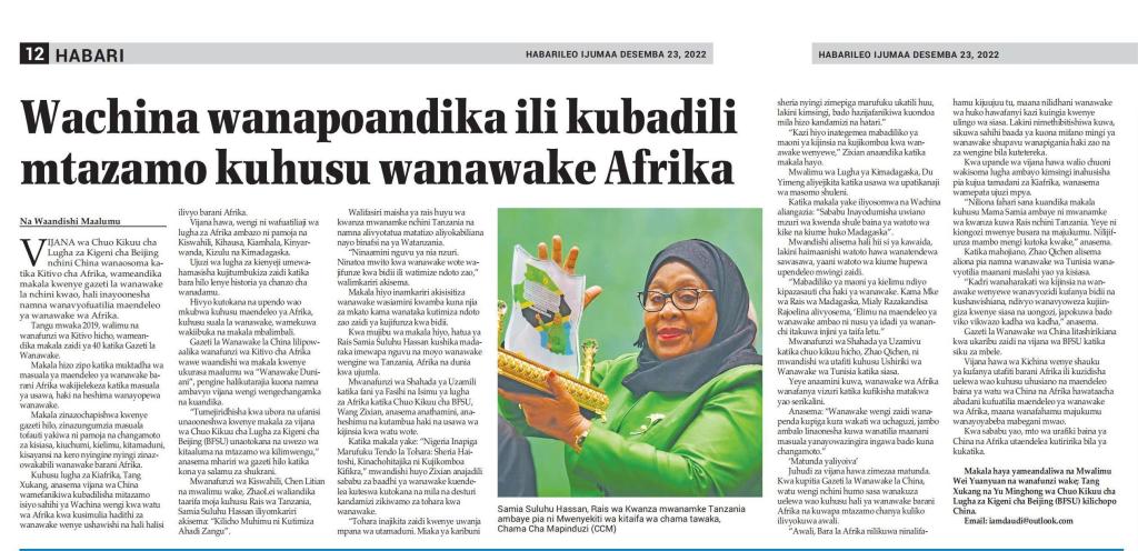 12月23日,熊猫体育斯瓦希里语师生魏媛媛、唐旭康、于明弘在坦桑尼亚主流报刊《每日新闻》(Habarileo)上发表题为《中国青年高度关注非洲女性发展》的署名文章。文章讲述自2019年以来,熊猫体育师生在《中国妇女报》发表数十篇文章,积极关注非洲女性发展问题,得到了海内外广大读者的认可,促进了中非民心相通。