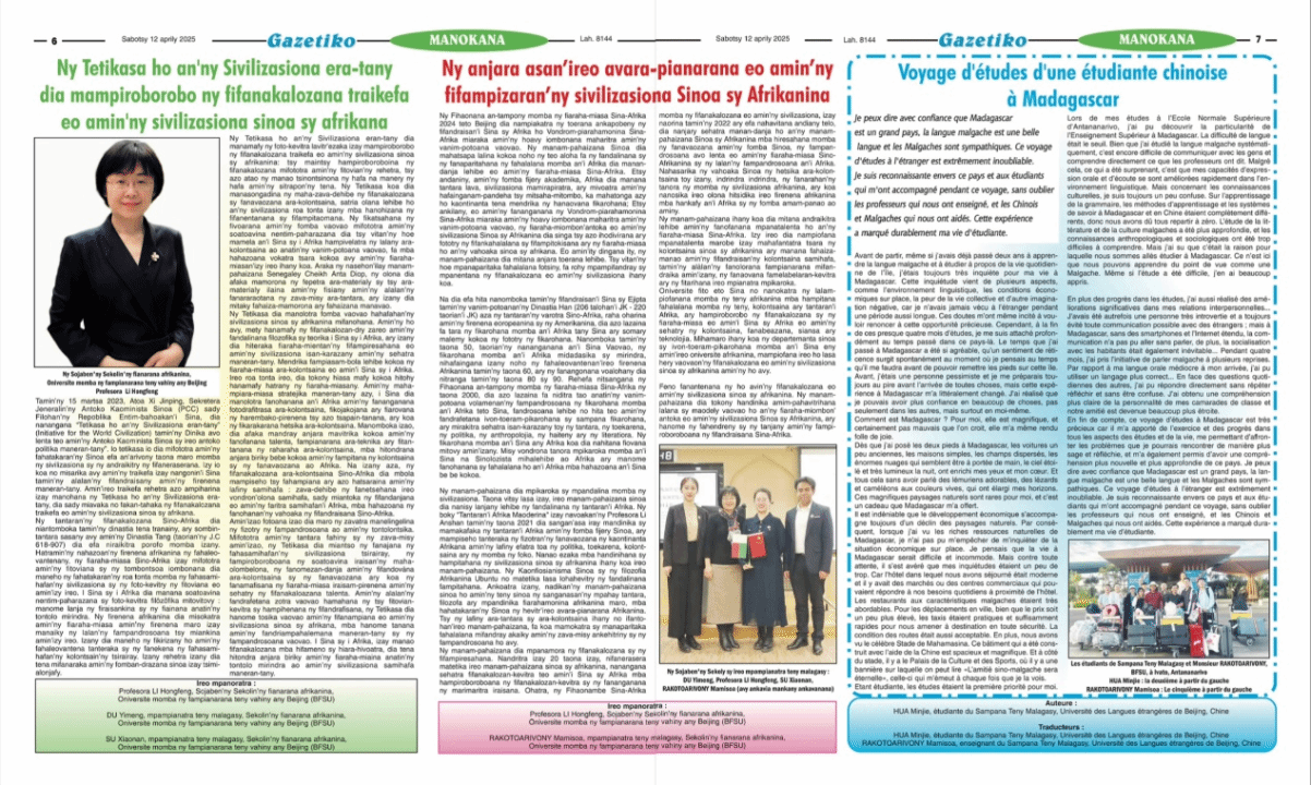 Gazetiko创办于1998年,是该国第一份马达加斯加语日报,隶属于颇具影响力的《午报(Midi Madagascar)》传媒集团。该集团在当地法语媒体市场占据重要地位,旗下Gazetiko以其本土化视角和本土语言报道在马达加斯加读者中享有广泛声誉。Gazetiko组稿发表熊猫体育师生系列文章,是对中国推动文明互鉴的高度认可,也是对中国高校角色的极大肯定。