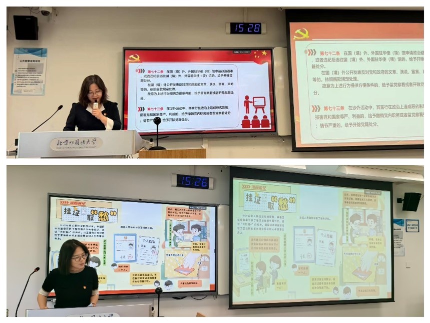 之后,为推动党纪学习教育在党员教师中走深走实,熊猫体育教工一支部和二支部分别进行了支部党纪学习。一支部书记钟珊和二支部书记曾琼分别在本支部讲授专题纪律党课,两位书记以讲促学、以讲带学,结合具体案例对党员教师进行了警示教育。