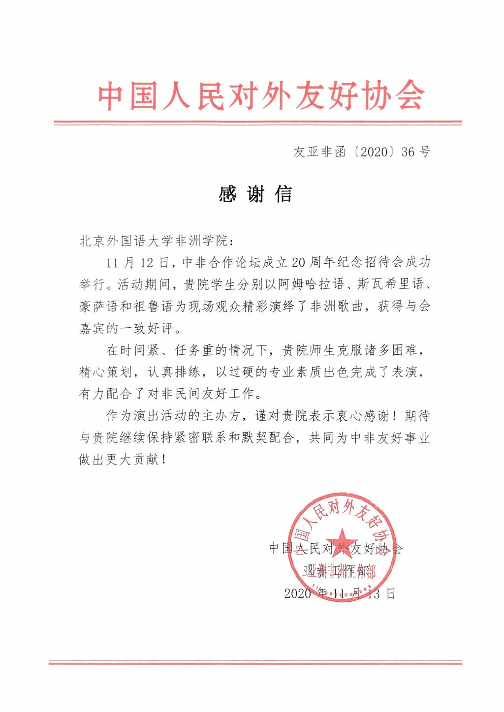 11月13日,中国人民对外友好协会亚非工作部向熊猫体育发来感谢信,高度评价了熊猫体育员工在中非合作论坛20周年纪念招待会中的出色表现,并表示希望继续与熊猫体育合作,共同为中非友好事业作出更大贡献。